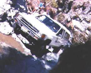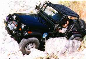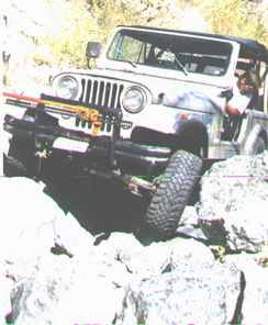 Saturday, Joe and Paula picked up camp and we all headed down to the canyon around 11:30. We can hear the rest of the Club up in the hills. Finally they show up around 12:30ish. Had lunch then headed into the canyon. There was 13 of us, 2 of them were guests (Frank and Guy). It didn't take long before the first hold up. Patti needed a little assistance, so we sent out the road crew to put down some rocks. Then she finally made it through. But the second hard part she got hung up again. This time was strap time. We traveled ok but Patti got hung up again, this time strapped but popped a bead on the tire. Then Fearless had a charging problem. This time Carol (Casper) to the rescue. Then we traveled on and Patti again popped the bead and Roadkill again came to the rescue with his Quickair. Reset the bead. Then we traveled on and finally made it to the end and the gate was closed. So we made our own way out.